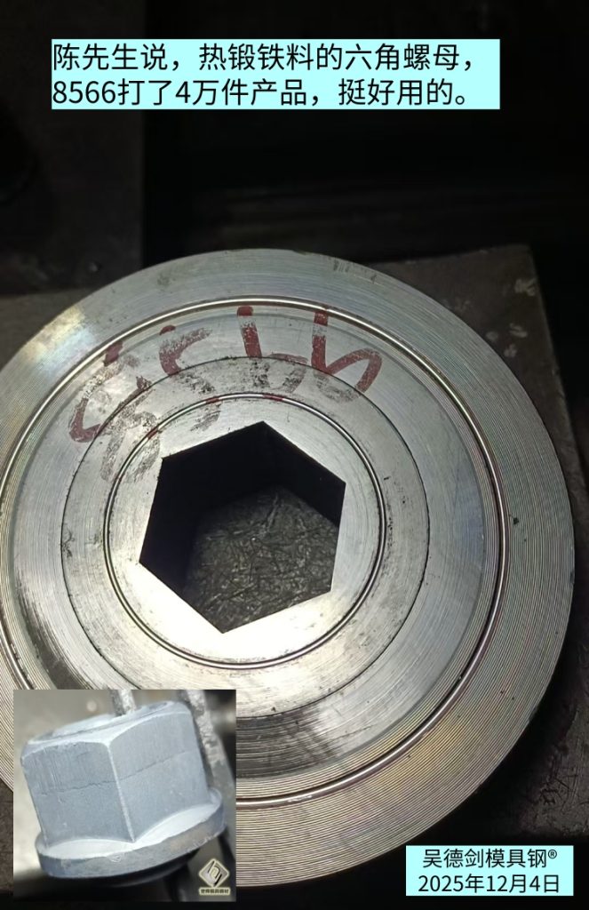 The heat resistance of 8566 die steel is the same as that of high-speed steel SKH51, with a hardness of 58-60HRC and toughness four times that of SKH51. 8566 die steel softens the three aspects of high heat resistance, high hardness, and high toughness perfectly, while other die steels cannot achieve such high hardness and maintain such high toughness. Mr. Chen said that the hexagonal nuts made of hot forged iron, 8566, have been used in 40000 pieces and are quite useful.