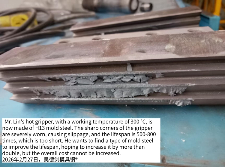 Mr. Lin is engaged in hot rolling, hot cutting, and hot forming, including a clamp with a working temperature of 300 ℃. He currently uses H13 mold steel, but the sharp corners of the clamp are severely worn, causing slippage and a lifespan of about 500 to 800. The lifespan is too short and the cost of accessories is high. He wants to find a mold steel to improve the lifespan, reduce the frequency of accessory replacement, and hope to double the lifespan. However, the overall cost cannot be increased. What die steel do you want to use?
