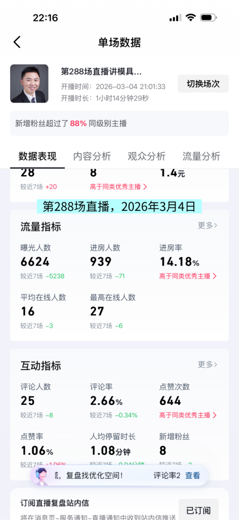 The exposure of this live broadcast room was 6624 people, with 939 viewers and an average viewing time of 1.08 minutes per person. The average number of online viewers was 16, with the highest being 27 people online. The data has decreased compared to before the year. Data won’t deceive you, if you don’t work hard, it will decrease.