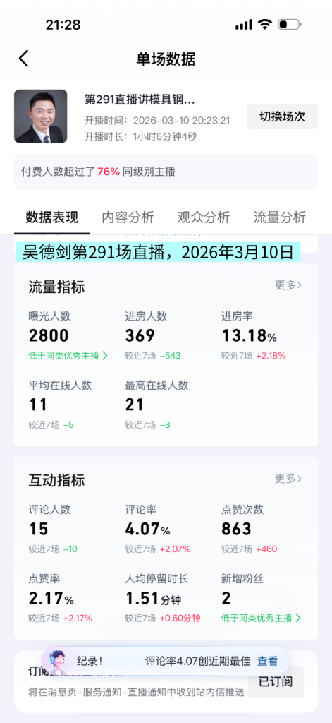 The exposure of this live broadcast room was 2800, with 369 viewers and an average viewing time of 1.51 minutes per person. The average number of online viewers was 11, with the highest being 21. The live broadcast data plummeted sharply.