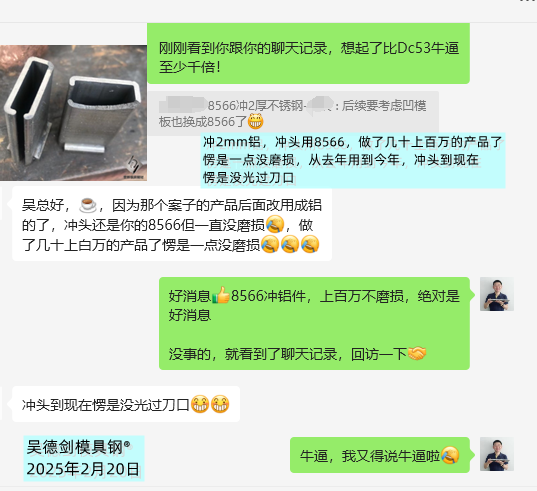 Mr. Qi from Shenzhen has stamped 2mm thick aluminum plates and used 8566 die steel for the punch. He has made tens of millions of products without any wear and tear. From last year to this year, the punch has not been completely polished. The tool steel has been chosen correctly. When stamping aluminum plates, the punch is very resistant to impact.