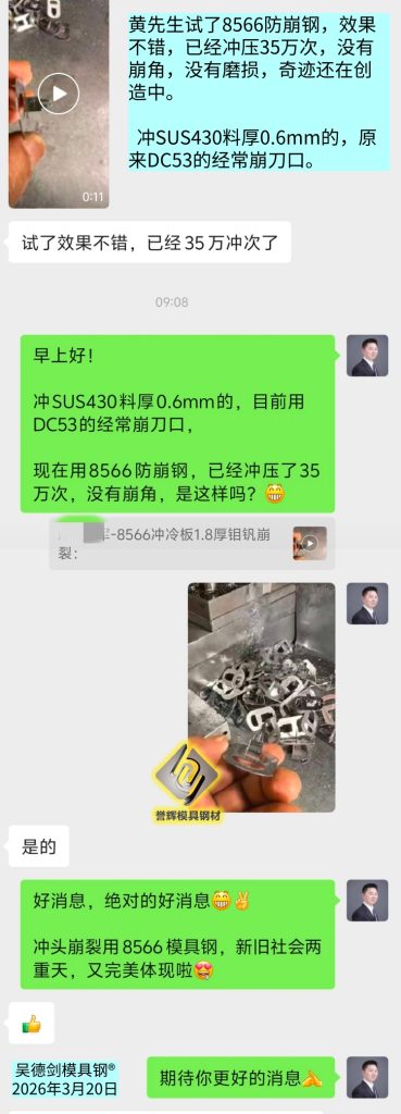 Upon receiving this good news, I deliberately confirmed with Mr. Huang that for SUS430 material with a thickness of 0.6mm, DC53 is commonly used for frequent blade breakage, while 8566 anti breakage steel is currently used. We have punched 350000 times without any corner breakage, is that correct?