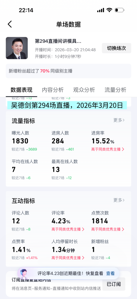 The live broadcast of the tool steel room was exposed to 1830 people, with 284 viewers and an average viewing time of 1.34 minutes per person. The average online audience was 7 people, and the highest online audience was 13 people. This live broadcast data has once again fallen to a low point and set a new low, which has made me feel down.