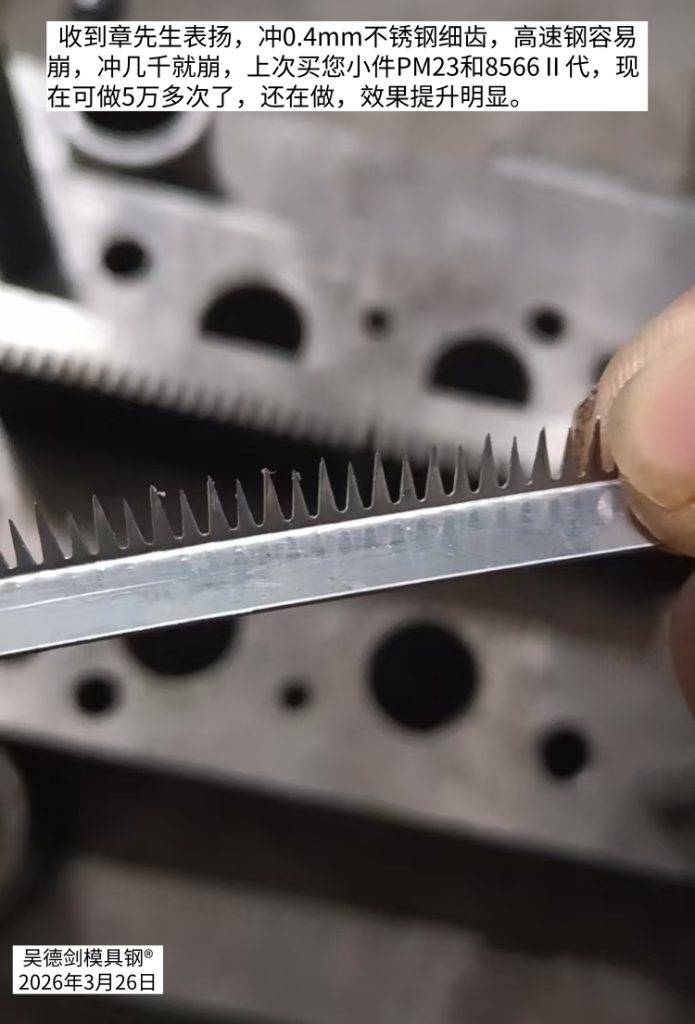 Received praise from Mr. Zhang for punching 0.4mm stainless steel fine teeth. High speed steel is prone to breakage, and can easily break after a few thousand strokes. Last time I bought your small PM23 and 8566 II generation, we have been able to make them for more than 50000 times and are still working on them. The effect has improved significantly.
