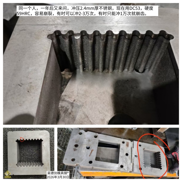 The same person came to ask again a year later, stamping 2.4mm thick stainless steel. Now using DC53 with a hardness of 59HRC, it is easy to crack. Sometimes it can be punched 20000 to 30000 times, and sometimes it can only be punched 10000 times before the teeth break. What tool steel should be used for stamping 2.4mm thick stainless steel?
