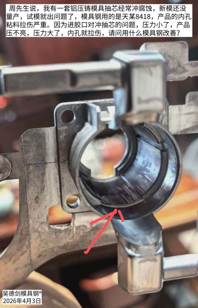 This morning, I received a consultation from Mr. Zhou. I have a set of aluminum die-casting molds that often corrode during core pulling. The new mold has not been put into mass production yet, and there was a problem during the trial mold. The mold steel used is Tian 8418, and the inner hole of the product is severely scratched due to adhesive material. May I ask what tool steel to use for improvement?